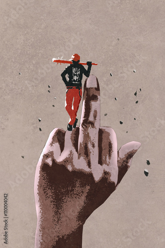 © grandfailure, Fototapeta premium middle finger hand sign with bad guy holding wooden stick,illustration painting
