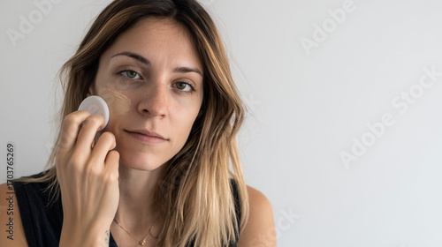 Fototapeta premium Midle East Woman in their 20 blending foundation on her face with makeup sponge