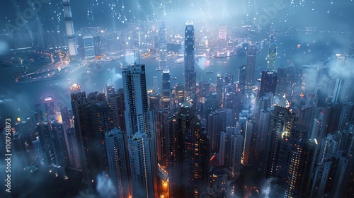 © Philipp, Fototapeta premium Midnight city skyline illuminated by vibrant fireworks as crowds celebrate below tall buildings