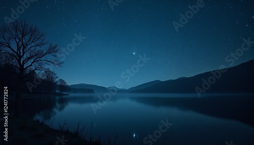 Fototapeta premium Midnight lake view with stars and reflection creating a serene night...