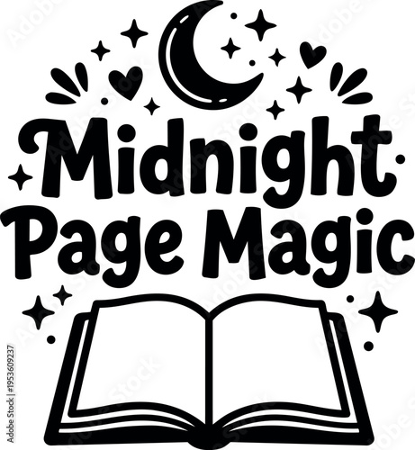 Fototapeta premium Midnight page magic lettering with open book and crescent moon vector art
