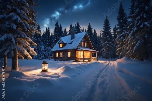 © christian, Fototapeta premium Midnight Snowscape Christmas House With Lantern Lights