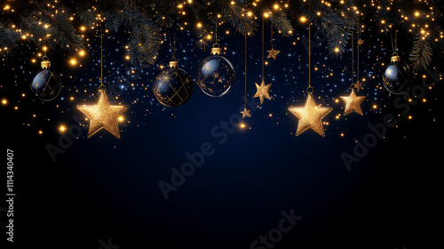 © Kingdola, Naklejka premium Midnight Sparkle: Elegant gold stars and dark blue baubles hang against a deep blue backdrop, creating a luxurious and festive Christmas scene. Perfect for holiday greetings or winter celebrations.