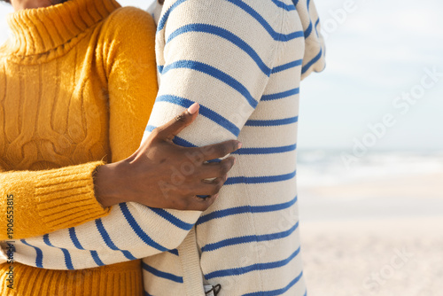 Fototapeta premium Midsection of multiracial couple embracing each other at beach on sunny day