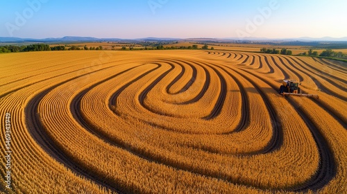 Naklejka premium Midwest wheat field drone shot capturing mesmerizing curved and linear patterns in golden harvest, vast agricultural landscape with textural details and shadows highlighting three-dimensional quality