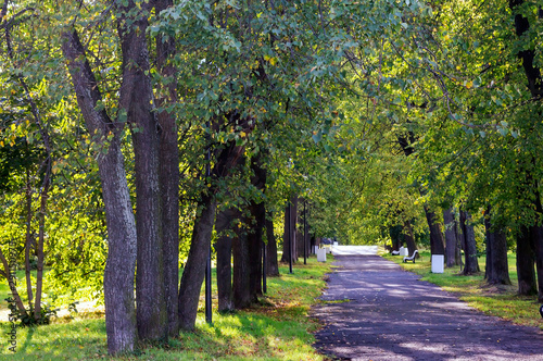© Ludmila, Naklejka premium Miejska aleja w parku wśród starych drzew liściastych