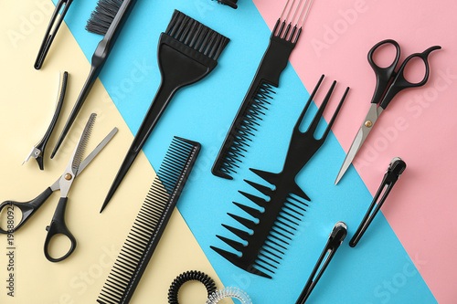 © New Africa, Fototapeta premium Mieszkanie świeckich skład z profesjonalnych narzędzi fryzjerskich na kolor tła