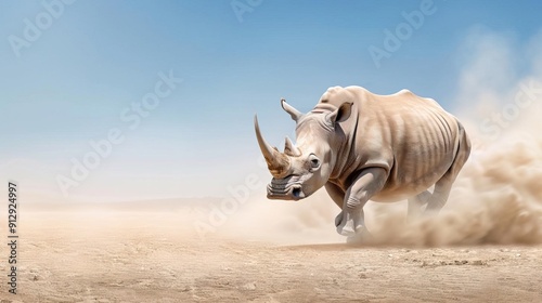 Fototapeta premium Mighty rhinoceros charging through dusty plains.