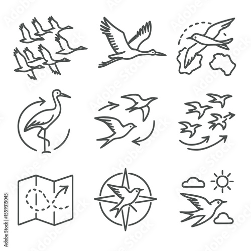 © Valentyna, Fototapeta premium Migrating Birds Icons. Line style icons of migrating bird species: flying geese in V-formation, stork in flight, arctic tern