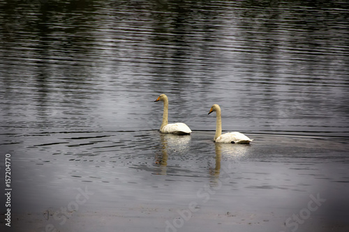© max5128, Obraz premium migrating Whooping Swans stopped for rest and feeding on river