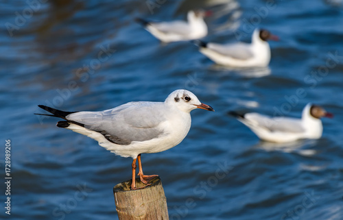© NPD stock, Obraz premium Migratory seagull standing on wooden pole near sea.
