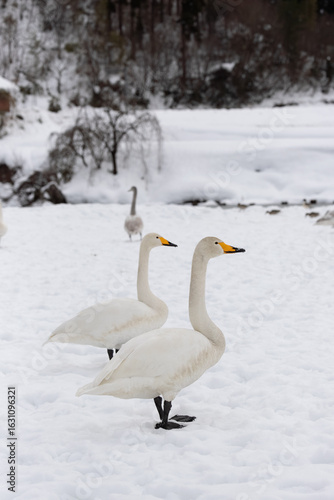 Fototapeta premium Migratory whooper swans (Cygnus cygnus) on a snowfield in Japan