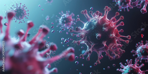 Fototapeta premium Mikroskopaufnahme eines neuen Virus. 3D-Darstellung mit Oberflächenproteinen. Wissenschaftliche Visualisierung für medizinische Forschung und Virologie
