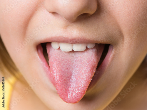 © valiza14, Fototapeta premium Miła dziewczyna pokazująca język. Dziecko wystawia język - z bliska.