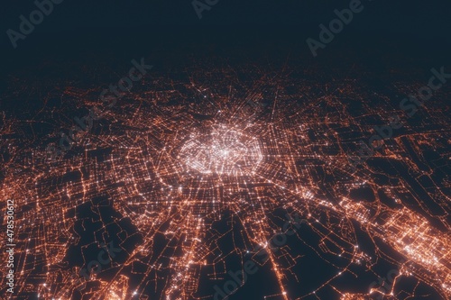 © Hairem, Fototapeta premium Milan aerial view at night. Top view on modern city with street lights