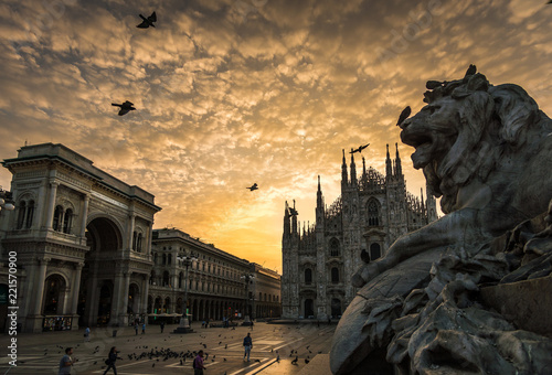 © Michele, Fototapeta premium milan duomo cathedral with lion sculpture and galleria vittorio Emanuele dramatic sunset