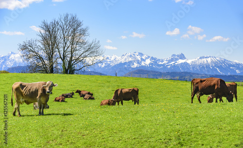 Fototapeta premium Milchkühe genießen den Frühling auf der Weide im Alpenvorland