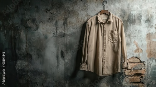 Naklejka premium Mildewstained shirt hanging in a dark, humid basement, light seeping through cracks, musty environment, decay