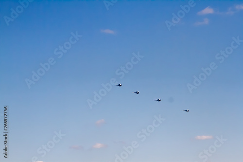 © Viktor, Obraz premium Military aircraft against the blue sky. Sunny day. Aircraft. Fighters