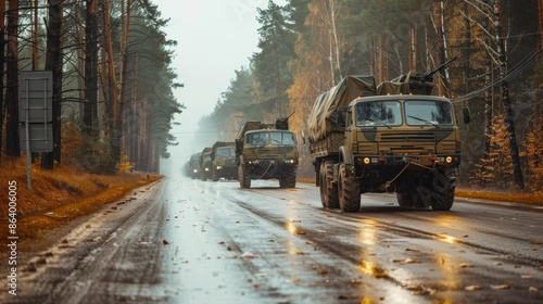 Obraz premium Military convoy on the road, carrying equipment through a forested area,...