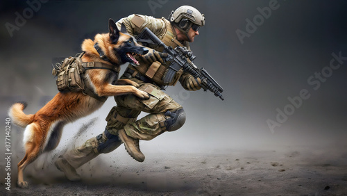 Fototapeta premium Military dog in action with his handler, war, anti-terrorism