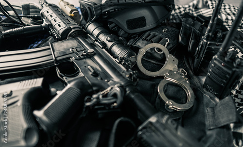 © santoelia, Fototapeta premium military equipman and weapons close up shooting