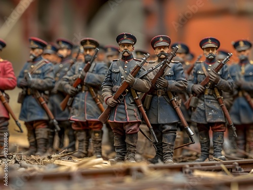© pavlofox, Obraz premium Military figures in historical uniforms prepare for a display at a model exhibition in late afternoon light