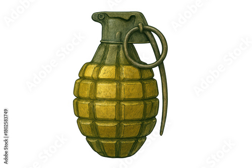 © PNG Kingdom , Fototapeta premium Military fragmentation grenade with a pin, an explosive weapon asset for gaming or war concepts. Transparent background