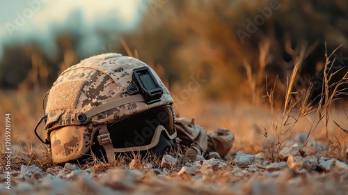 Fototapeta premium Military helmet resting on ground surrounded by dry grass and rocks under...
