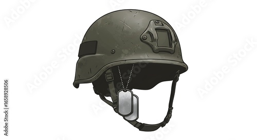© Loback, Naklejka premium Military Helmet with Dog Tags: Vintage Style Combat Illustration, Serious Mood, Vector Graphic.