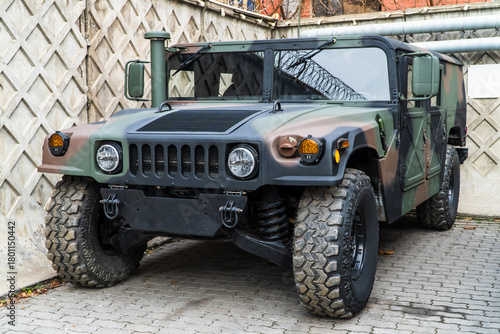 © Dmitry Presnyakov, Fototapeta premium Military Humvee parked on an street, showcasing its rugged design and operational readiness in a secure military base. Khaki camouflage military Hummer front view. Army USA.