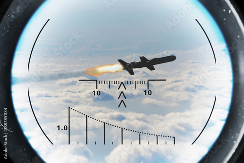 © Anelo, Fototapeta premium Military missile with jet trail captured by optical targeting system.