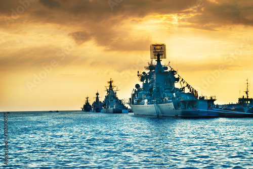 © Pavlo Vakhrushev, Obraz premium Military navy ships in a sea bay