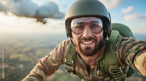 Fototapeta premium Military Parachutist Captures Selfie Mid-Jump with Aircraft in Background