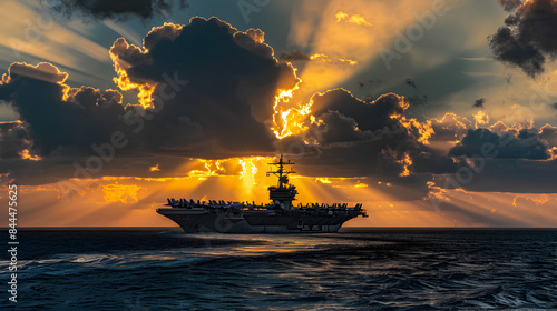 © Amna, Fototapeta premium Military Ship Silhouette at Sunset