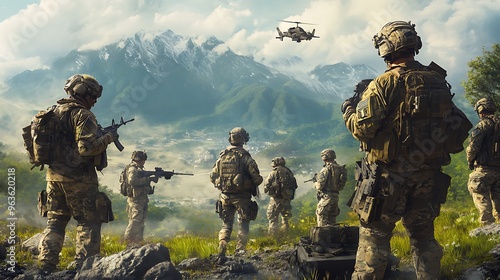 Fototapeta premium Military Soldiers in Mountainous Terrain with Helicopter