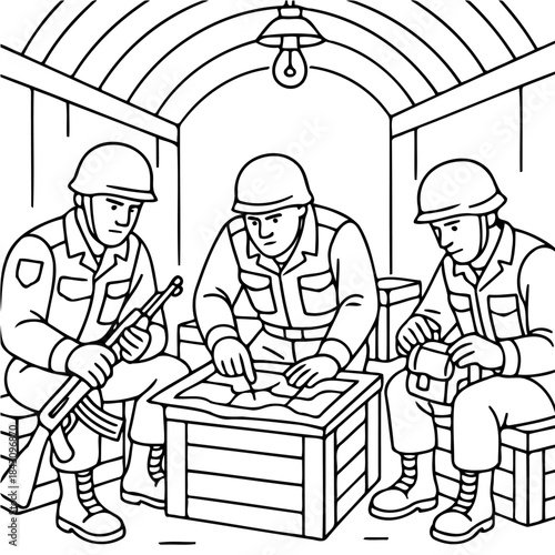 © CrazyJuke, Obraz premium Military Strategy Session: Inside a bunker, soldiers meticulously review a tactical map, preparing for a mission while a soldier attentively examines equipment, focused on upcoming action.