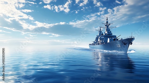 © Pumapala, Fototapeta premium Military Warship Sailing on a Calm Sea