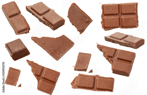 © iKatod, Fototapeta premium Milk chocolate broken into pieces. Chocolate bar, crumb, shavings. Chocolate slices isolated on white background.