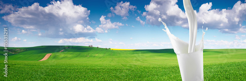 © alexugalek, Fototapeta premium Milk flowing into glass on natural background