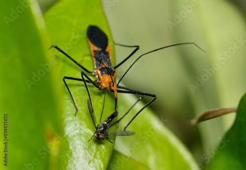 Fototapeta premium Milkweed assassin bug Zelus longipes insect with fly prey nature Springtime...