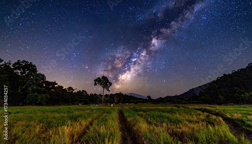 © egr, Fototapeta premium Milky Way Across Grassy Field at Night Under Starry Sky Panoramic View