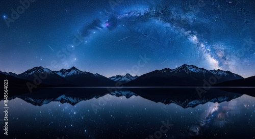 Obraz premium Milky Way Galaxy Reflected in Still Lake Waters with Mountain Silhouette in...