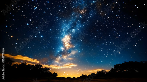 © cris, Obraz premium Milky Way galaxy shining brightly over dark trees and orange horizon.
