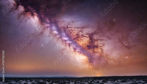 Fototapeta premium Milky way galaxy shining over desert landscape at night