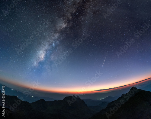 © Mumemories, Naklejka premium Milky way galaxy with shooting star at twilight sunset