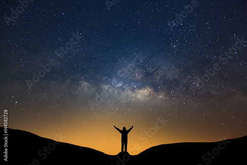 Naklejka premium Milky way galaxy with stars and silhouette of a standing happy man, Long...