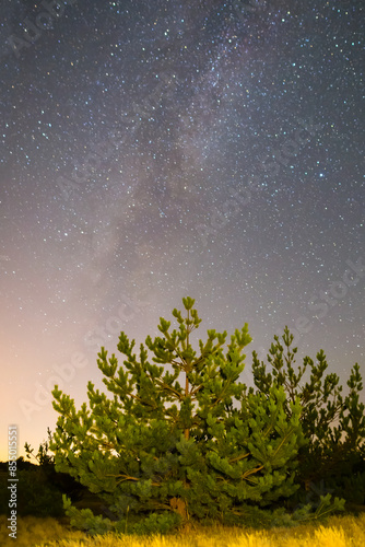 © Yuriy Kulik, Fototapeta premium milky way on night starry sky above fir forest