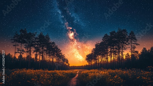 © harryaishi, Obraz premium Milky Way over a sunset forest path.