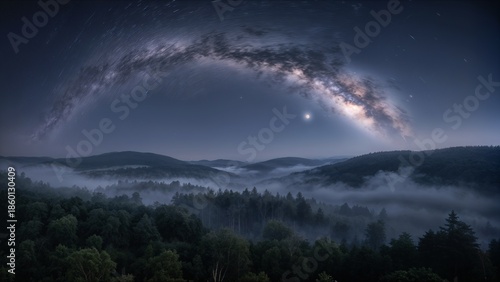 Fototapeta premium Milky Way over misty forest landscape at night.